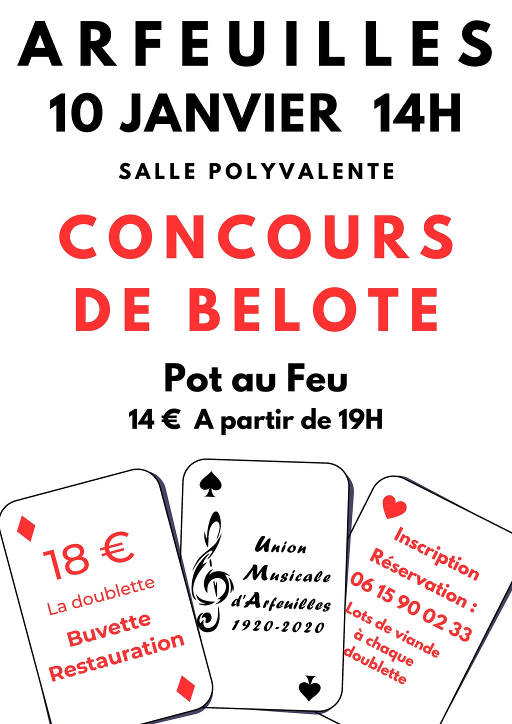 L'UNION MUSICALE D'ARFEUILLES VOUS PROPOSE SON CONCOURS DE BELOTE LE SAMEDI 10 JANVIER A 14H SALLE POLYVALENTE ALICE ARTEIL RUE FRANCOIS VACHER.