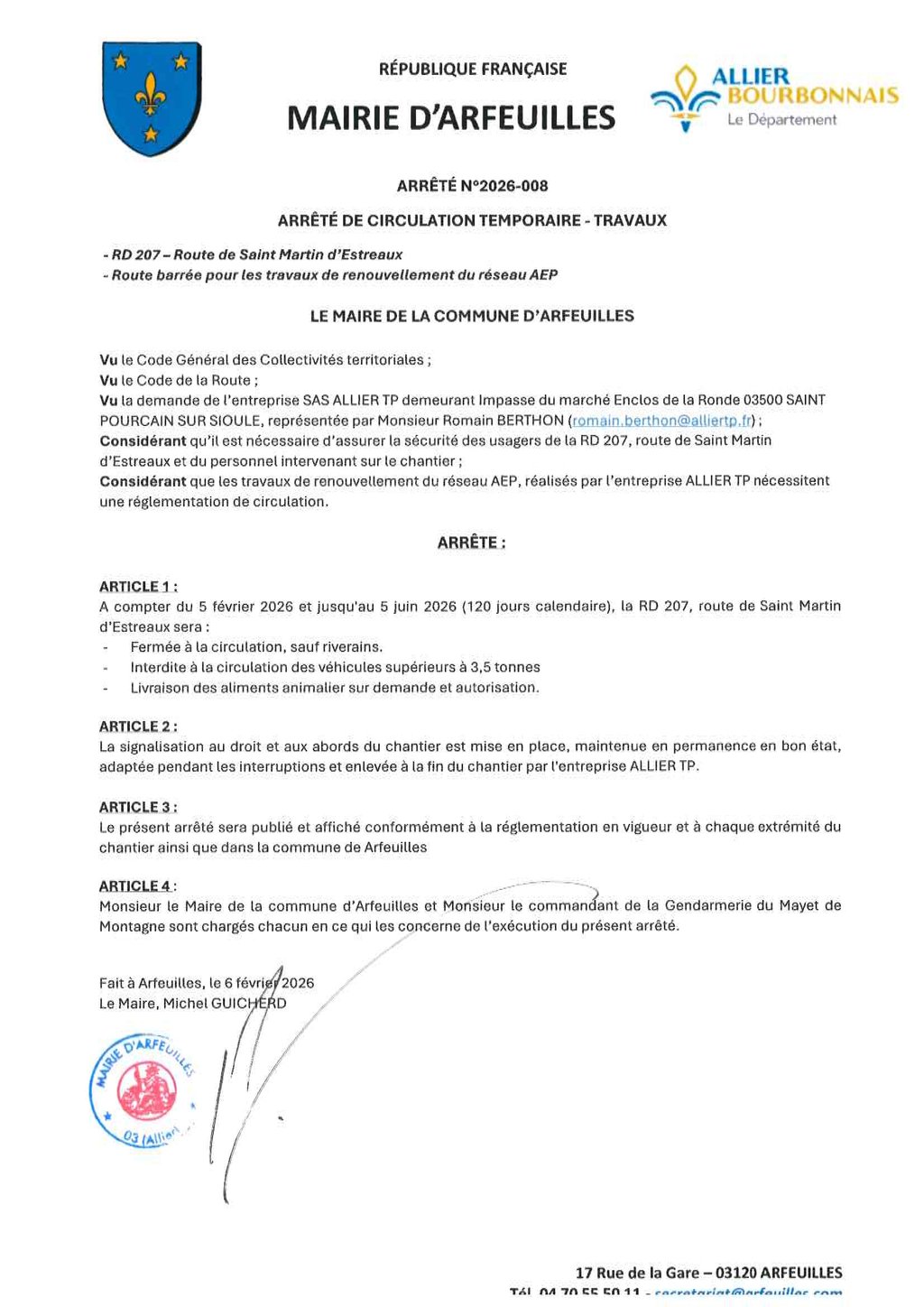 La RD 207 (route de st martin d'estréaux) sera fermée à la circulation .