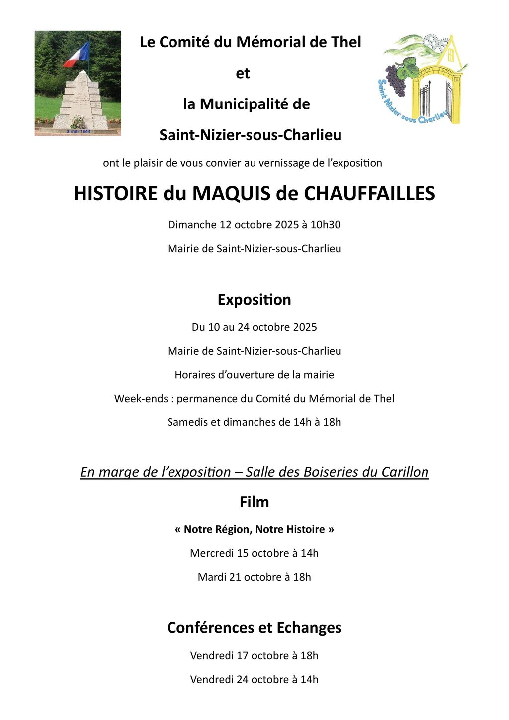 Exposition Du 11 au 24 octobre 2025 Mairie de Saint-Nizier-sous-Charlieu Horaires d’ouverture de la mairie Week-ends : permanence du Comité du Mémorial de Thel Samedis et dimanches de 14h à 18h